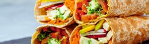 מקפלים את הטורטייה כמו מעטפה, חוצים לחצי ואפשר לאכול ביד או לארוז לקופסה.