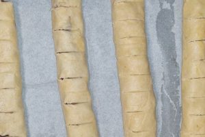 מחלקים את הבצק לשניים, לוקחים חצי אחד, מרדדים אותו על נייר אפייה ליצירת מלבן ארוך (ניתן להניח נייר אפייה נוסף מעל הבצק כדי למנוע הידבקות של הבצק למערוך).