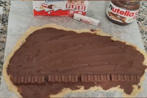 על הבצק מורחים את ממרח הנוטלה, מעליו מניחים לאורך הבצק את אצבעות הקינדר ומתחילים לגלגל.