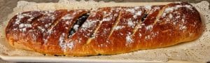 על משטח מקומח מרדדים כל חלק מהבצק לעלה בצורת מלבן בעובי 1/2 ס"מ. מורחים את המלית על 3/4 משטח המלבן . יוצרים חריצים אלכסוניים על גבי הבצק ללא המלית במרווחים של 1 ס"מ. מגלגלים את הבצק לרולדה עד החלק המחורץ, מברישים בביצה את הבצק ללא המלית וממשיכים לגלגל עד הסוף. מניחים את גלילי הבצק בתבנית המרופדת בנייר אפייה, כשהחריצים מופנים כלפי מעלה, מברישים את פני העוגות בביצה ומתפיחים פעם נוספת במשך חצי שעה. מכניסים את תבנית העוגות לתנור אפייה שחומם מראש לטמפ' של 190 מעלות ואופים במשך 20 דקות עד להזהבה.
